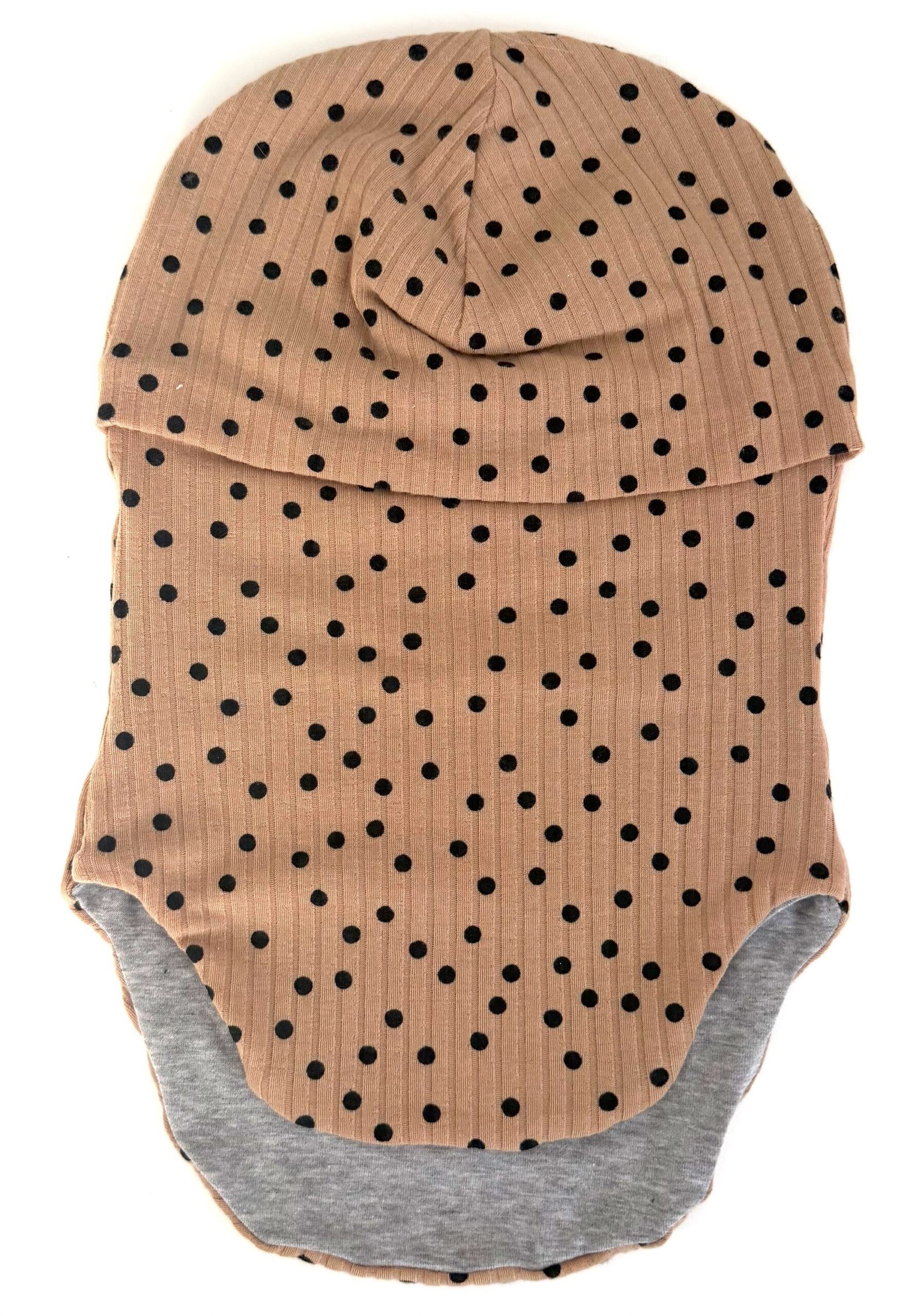 Mugav ja praktiline tuukrimüts hoiab lapse pea, kõrvad ja kaela tuule eest kaitstuna. Müts on valmistatud kahekordsest pehmest puuvillasest trikotaazkangast, mis on hingav ja lapsele väga mugav kanda.